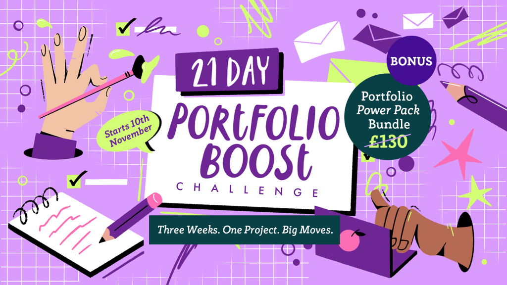 Our 21 Day Portfolio Boost Challenge runs Monday 11th November – Thursday 11th December. All live sessions will be recorded and shared inside our dedicated 21 Day Challenge space hosted inside Inkygoodness Collective.*